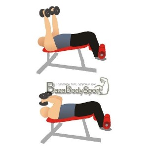 Вторым упражнением на трицепс будет разгибание рук с гантелями лёжа. Держа руки ровными и, развернув, ладонями друг к другу, нужно не разводя локти согнуть их на 90 градусов и выжав вверх, вернуться в исходное положение. Выполнять 4 подхода по 8-10 раз.