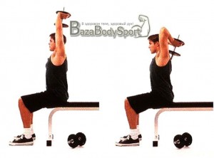 Первым упражнением в комплексе будет «французский жим» гантели из-за головы двумя руками в положении сидя. Главное не разводить локти в стороны по всей амплитуде движения рук. Выполнять 4 подхода по 10-12 повторений. Естественно вес выбрать соответствующий.