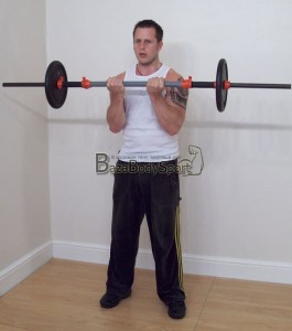 - Любой эффективный комплекс упражнений для мышц рук в домашних условиях для мужчин включает в себя подъём штанги на бицепс в положении стоя. Если грифа нет, можно заменить его гантелями, правда придётся постоянно контролировать расположение рук, чтобы двигались они в одной перпендикулярной плоскости, а гантели не проворачивались в кистевом суставе. «Бить» мышцы бицепса лучше большим весом: 4 подхода по 6-8 повторений (перерыв не более двух минут).