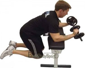 - Подъём гантели одной рукой с упором в локтевом суставе (стул или диван с углом наклона не более 30 градусов). В данном случае вес лучше подобрать меньше и сделать 4 подхода на 12-15 раз. Последние 3-4 раза должны вызывать жжение бицепса руки (можно помогать в подъёме второй рукой).
